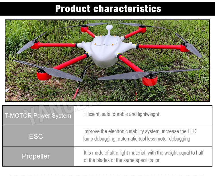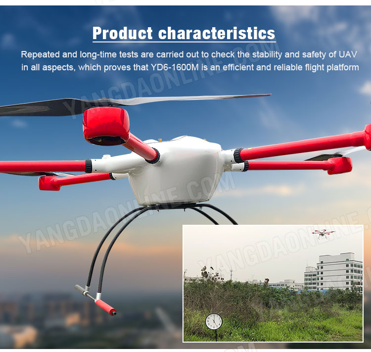 Thanks to the lightweight structure design and powerful propulsion system, YANGDA YD6-1600M RTF drone can fly 55 minutes with 5KG payload, 30 minutes with 10KG payload.
